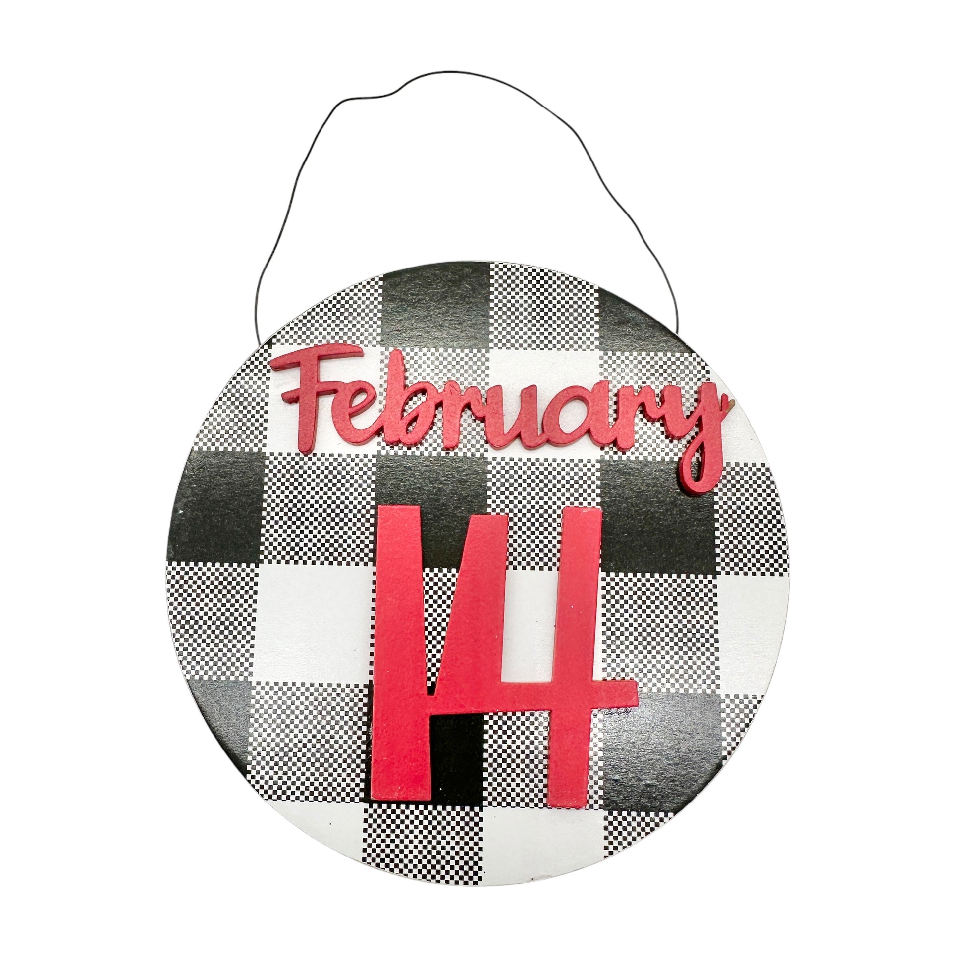 Celebrate Valentine's Day with this charming hanging "February 14" sign! Made of durable materials, this 4.5 inch round sign feature a black and white plaid background with and red color lettering and it has a convenient hanging wire. Perfect for adding a festive touch to your home decor or for gifting to your loved ones.