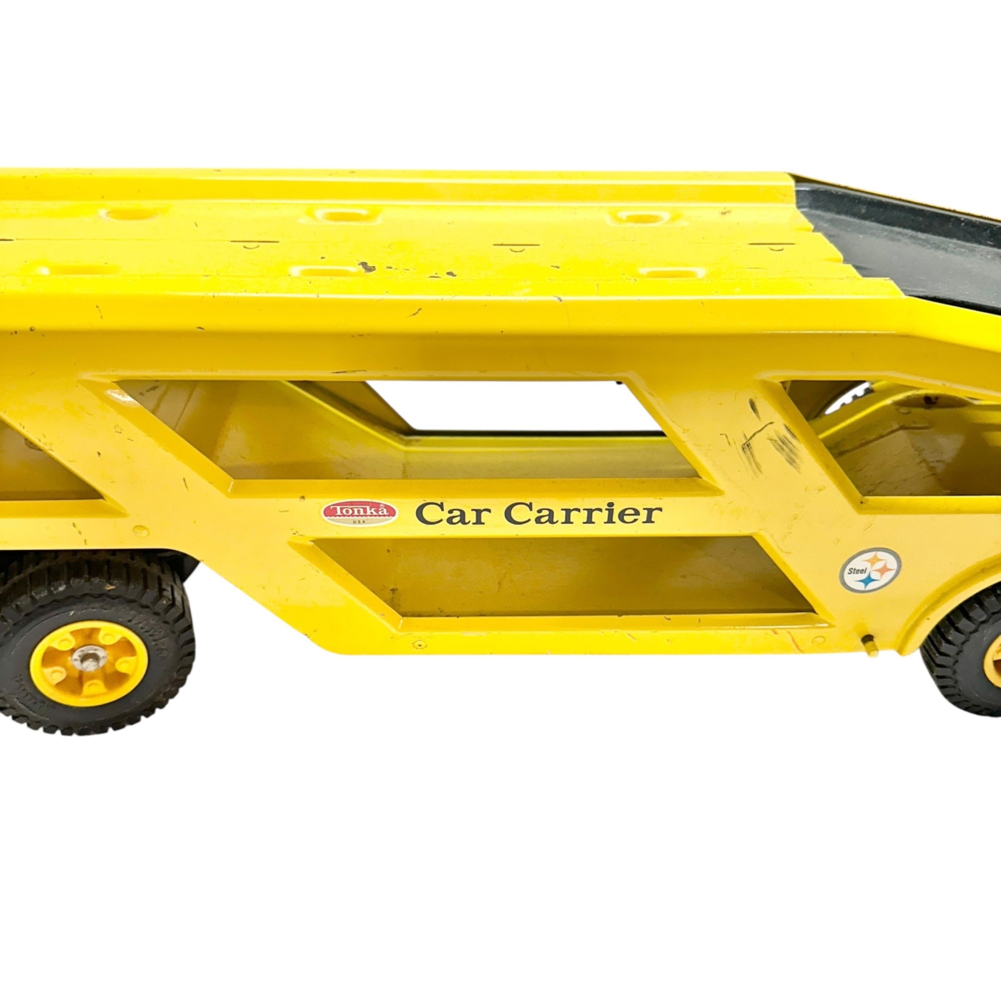 This yellow Tonka car carrier truck, a nostalgic gem from the 1970s, takes you back to simpler days of imaginative play and durable craftsmanship. Its robust metal construction and classic design tell a story of countless adventures, transporting tiny vehicles and young dreams across linoleum landscapes.