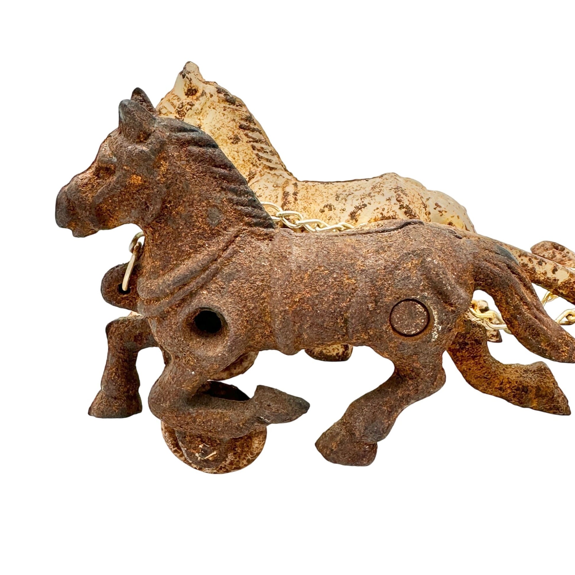 Step back in time with this vintage cast iron horse-drawn trolley model, echoing a bygone era of charming transport. Its rustic finish and detailed craftsmanship invite a sense of nostalgia, perfect for collectors or as a timeless decor piece.