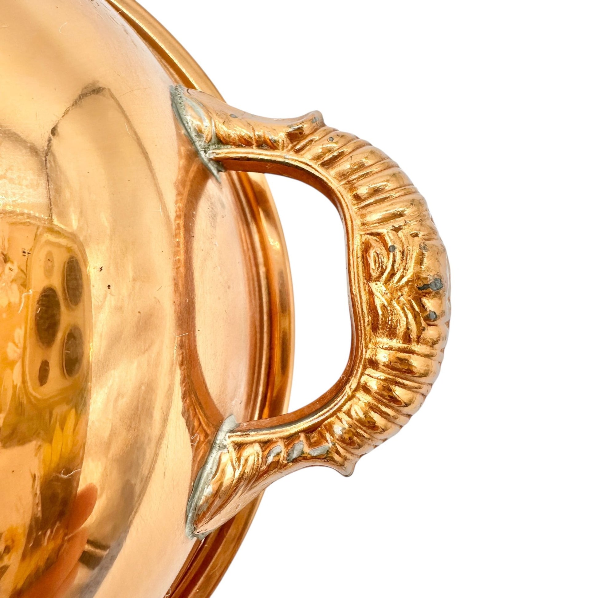 This vintage copper serving dish, with its ornate handles and elegant design, tells a story of timeless gatherings and shared meals. Its warm copper glow adds an inviting touch, while the intricate detailing reflects the craftsmanship of a bygone era. A perfect centerpiece to inspire cherished moments.