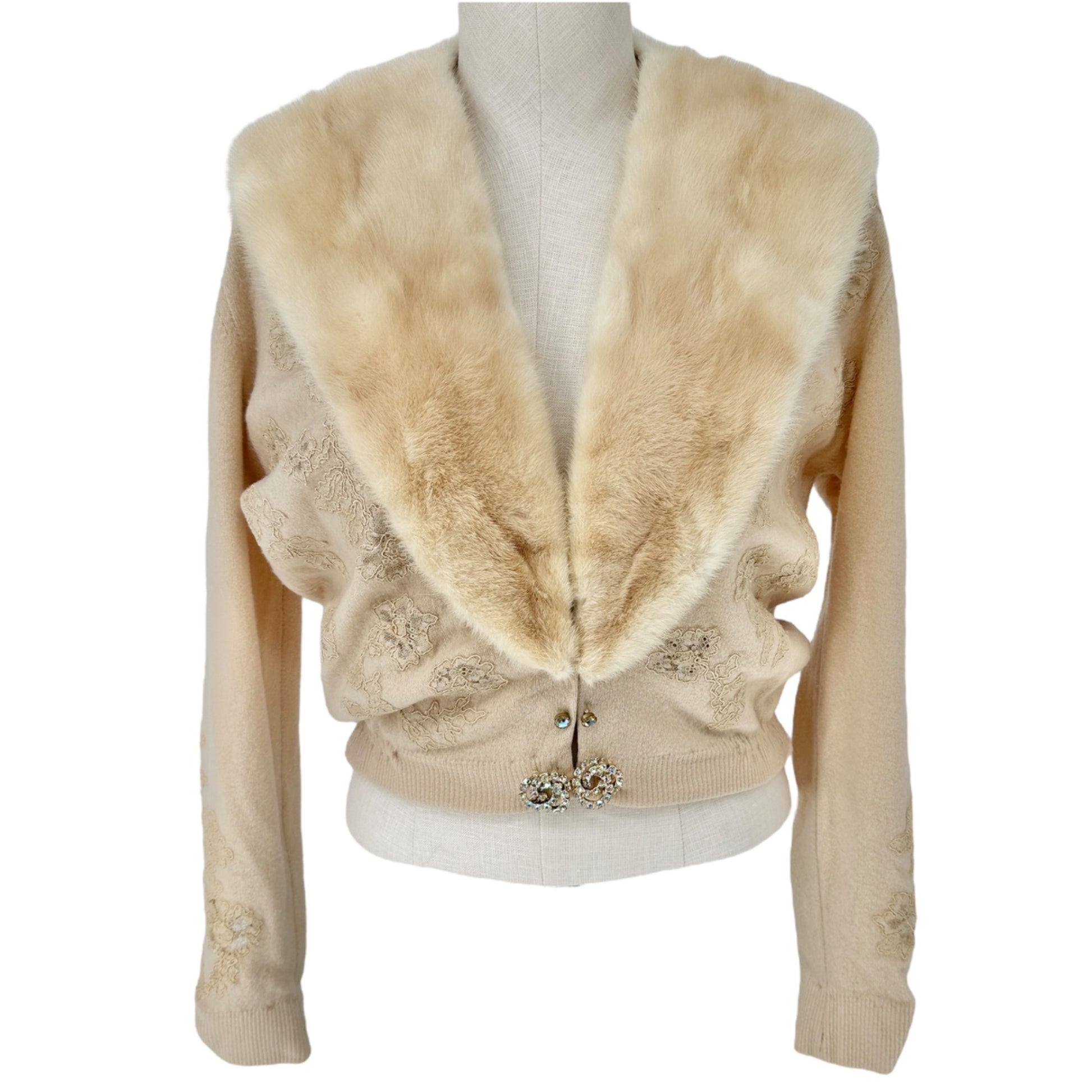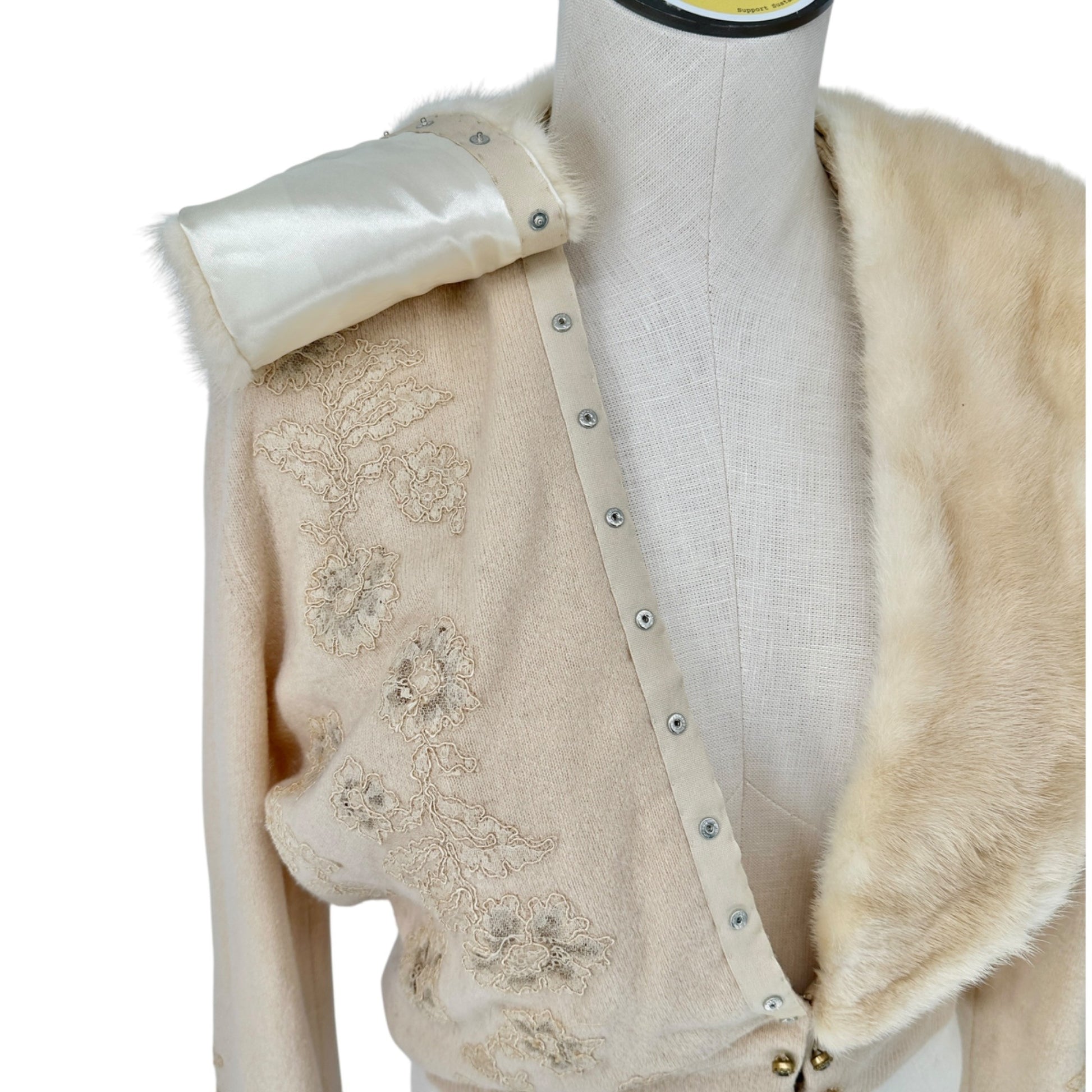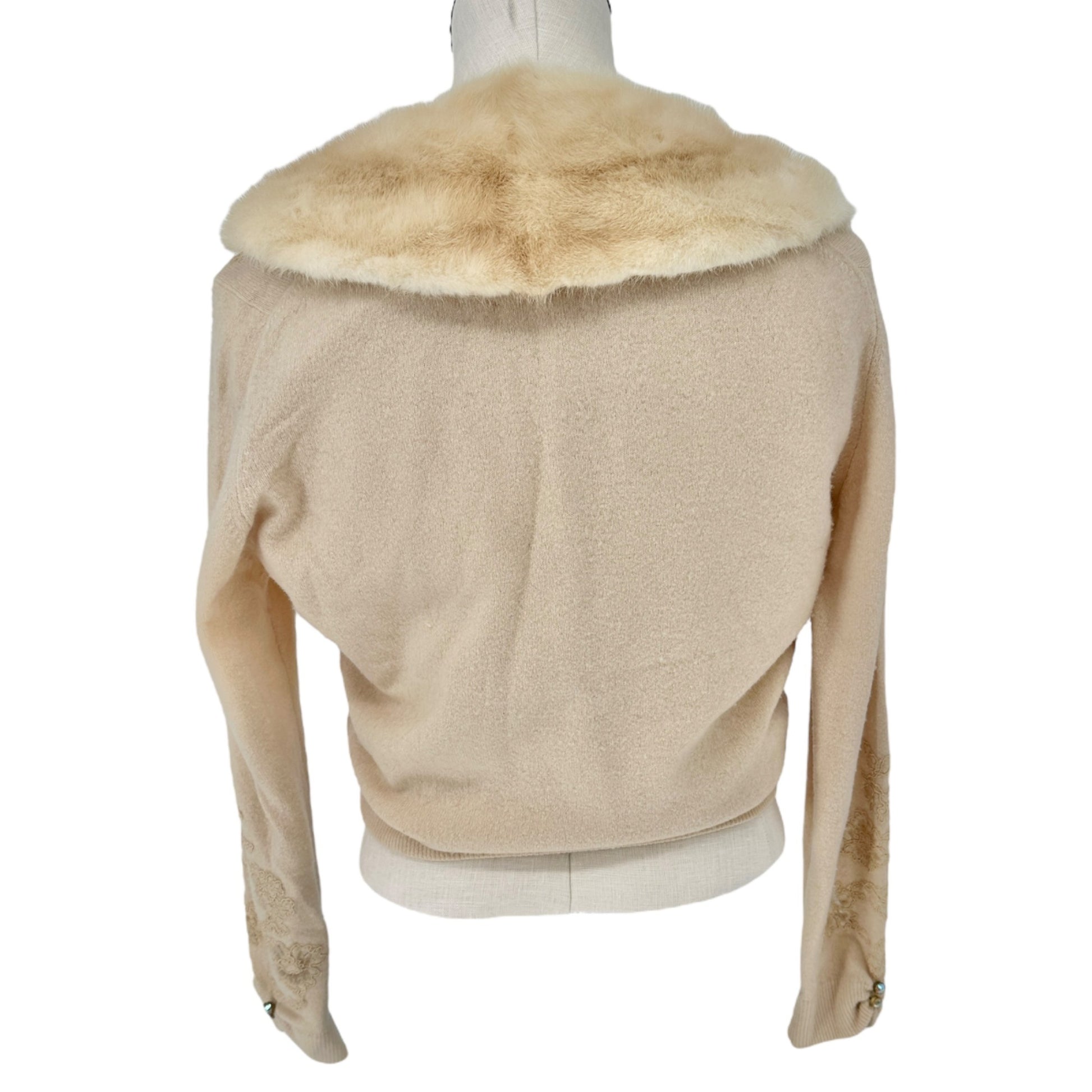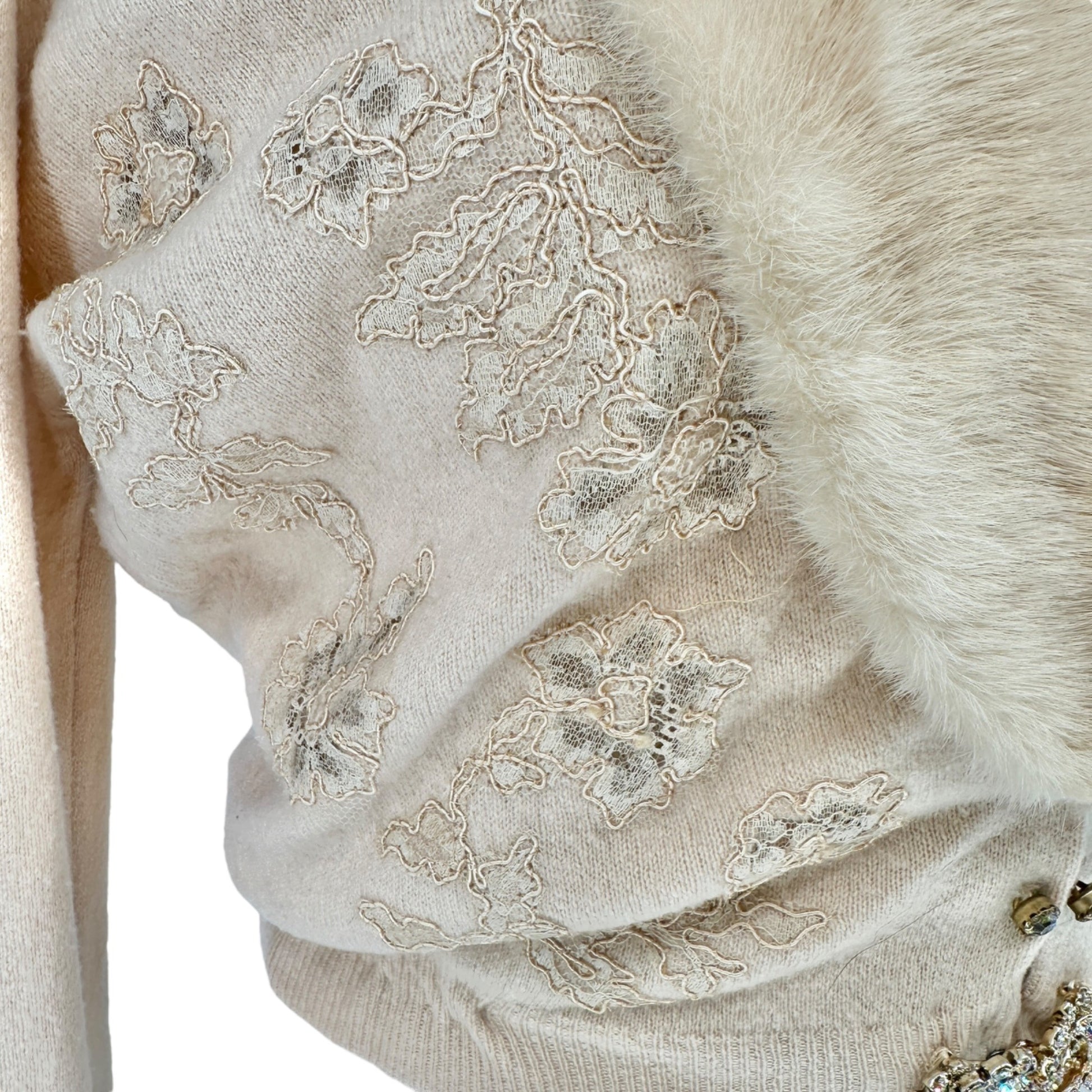Vintage Pearl Kirsten Cardigan Womens S Beige Fur Collar Lace Rhinestone Detail