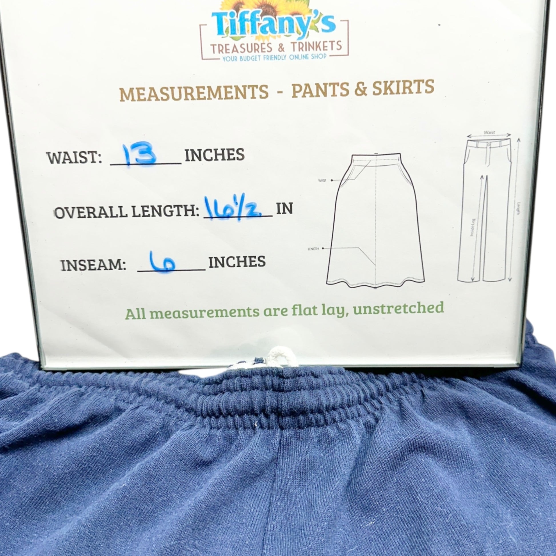 Waist = 13 inches (unstretched), Overall length = 16 1/2 inches, Inseam = 6 inches.