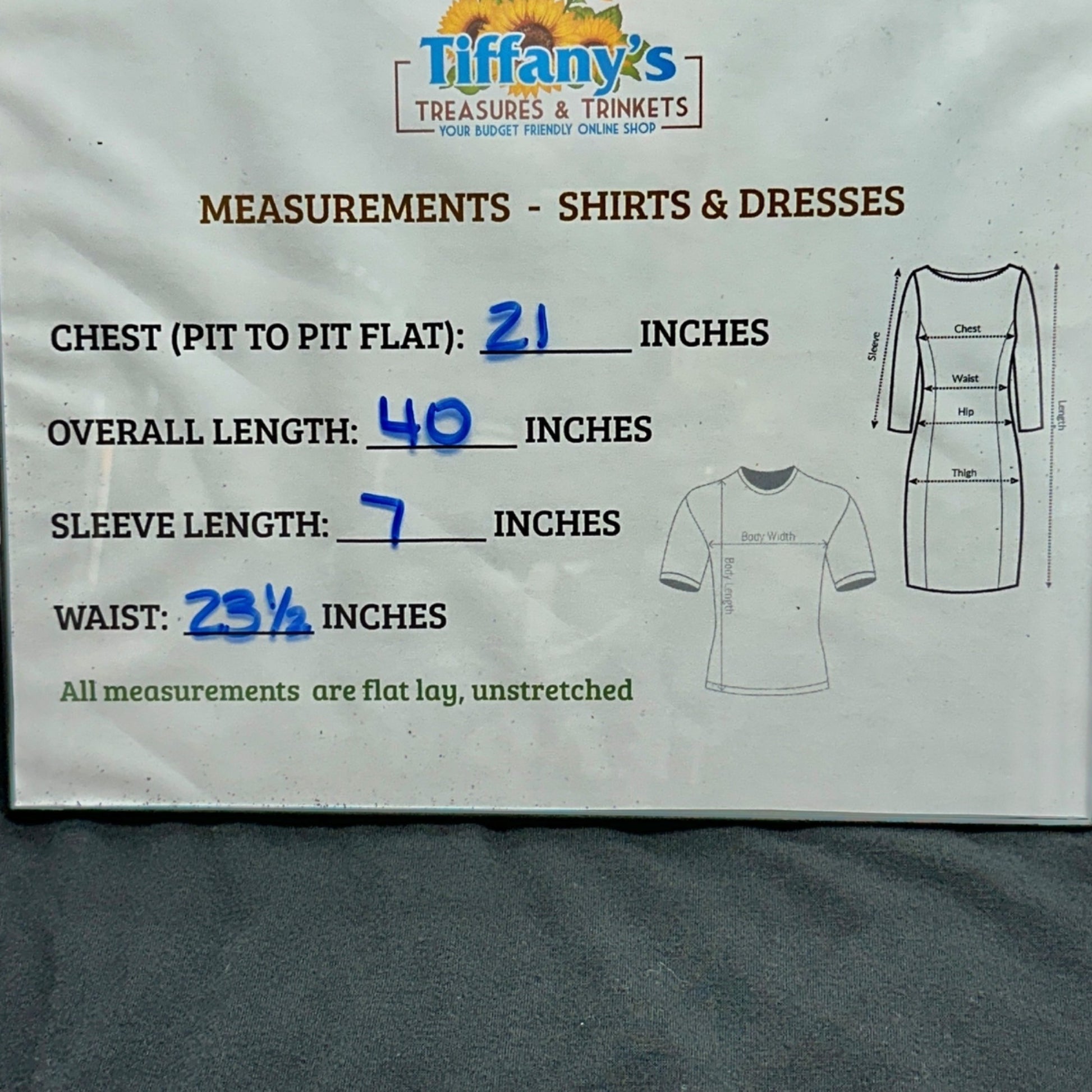 Measurements: Chest (pit to pit flat) = 21 inches, Overall Length = 40 inches, Waist = 23.5 inches.