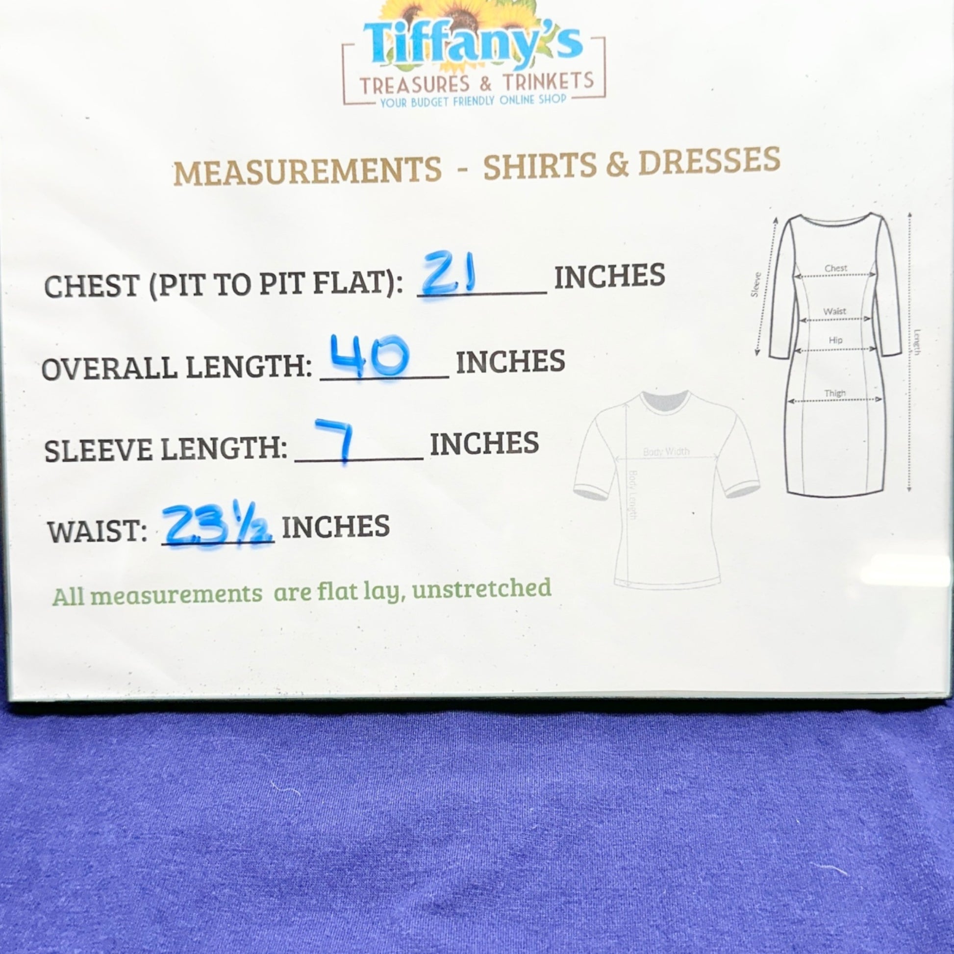 Measurements: Chest (pit to pit flat) = 21 Inches, Overall length = 40 Inches, Sleeve length = 7 Inches, Waist = 23.5 Inches
